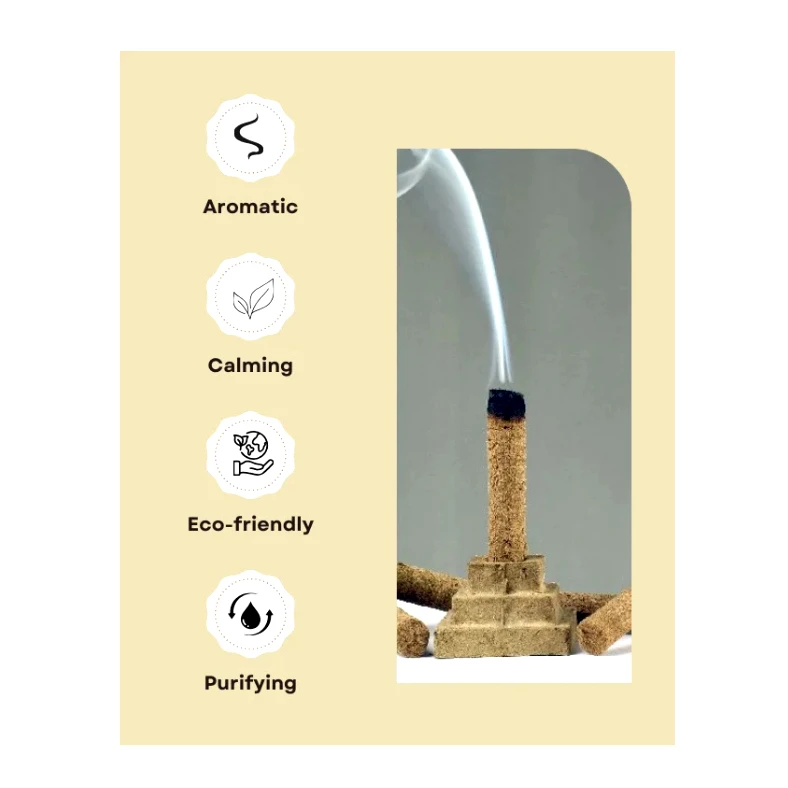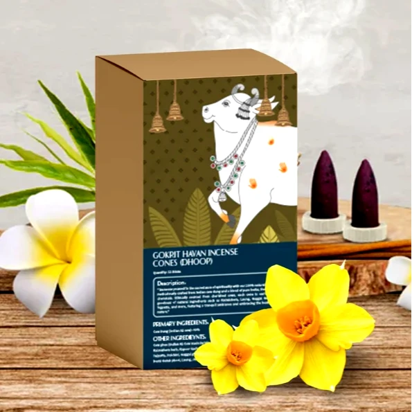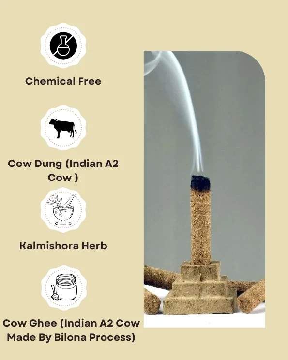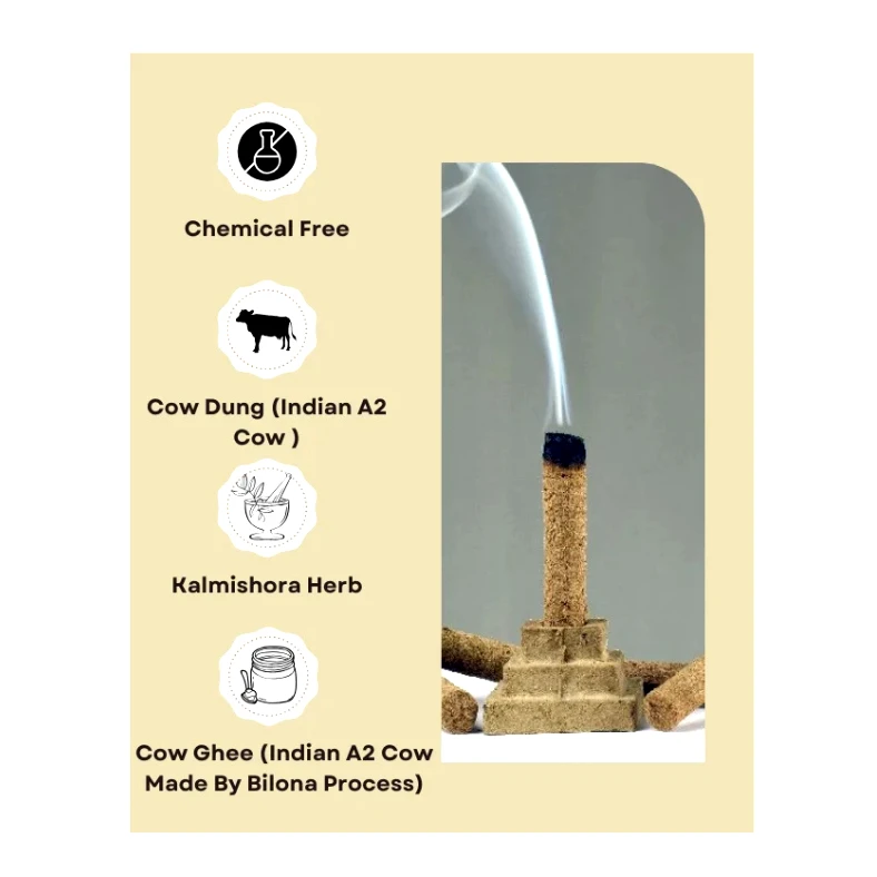 2. Cow Dung and Ghee Sourced from Desi A2 Cows. It is used to purify air as it is said to release oxygen when burnt with Ghee.