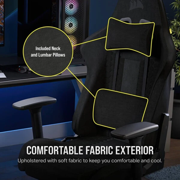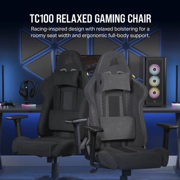 Recline into comfort whether playing or working with the CORSAIR TC100 RELAXED Gaming Chair - Fabric, featuring a racing-inspired design with a wider seat surface.