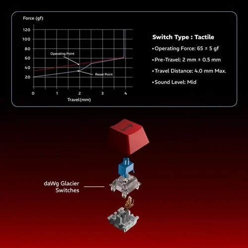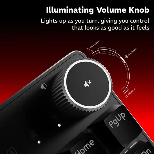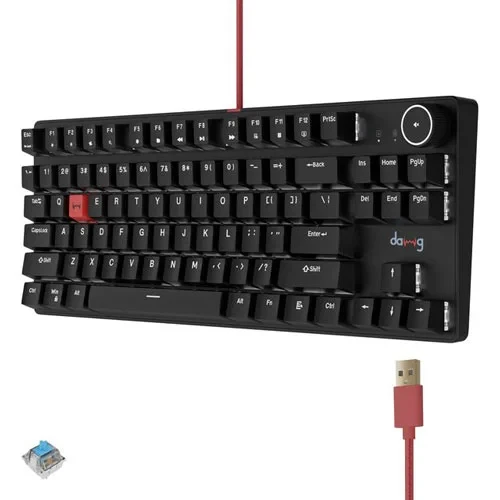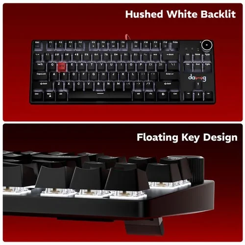 Dawg HighKEY 373 gaming mechanical wired keyboard featuring ultra-responsive daWg Glacier Switches that offers crisp feedback, fast actuation, and pro-level precision. With an 80% compact layout, 1000Hz polling rate, pre-lubed switches, floating key design, and white backlighting, every move feels smooth and controlled. Add a glowing volume knob and durable red braided cable, and you’re all set for serious gameplay.