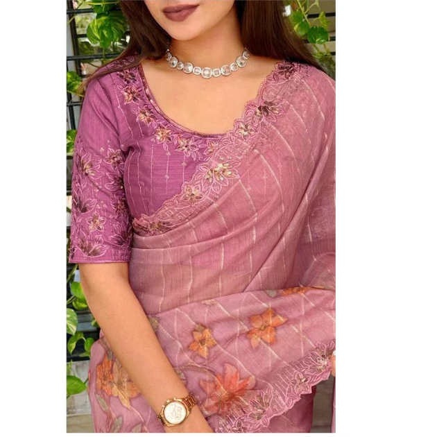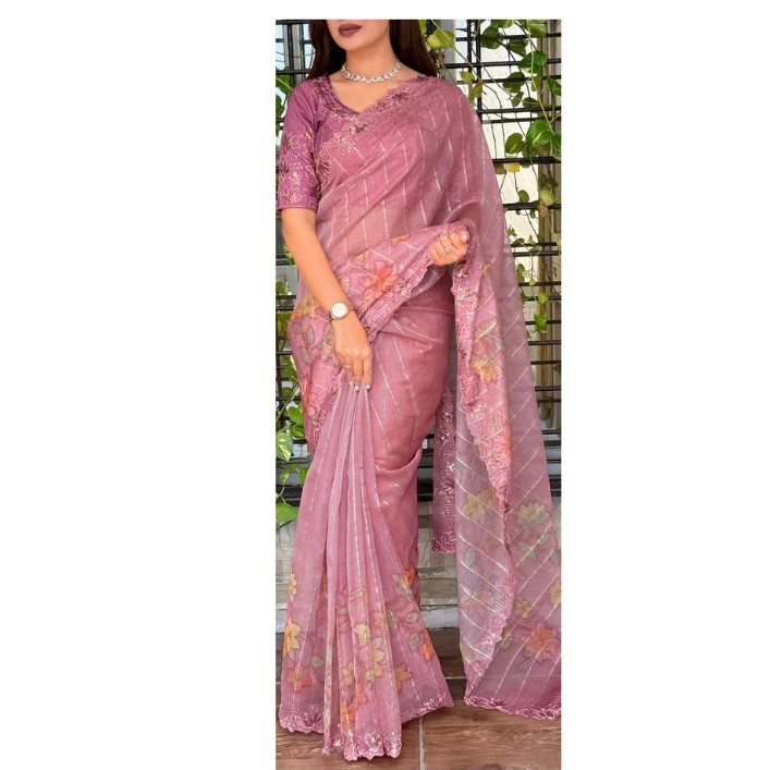 Crafted from lightweight and sheer organza fabric, this saree offers a graceful drape with a soft, flowy silhouette that flatters every body type. The subtle shimmer of sequins combined with fine thread work creates a luxurious appeal, making it perfect for weddings, festive celebrations, parties, and special occasions.
