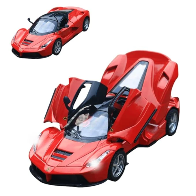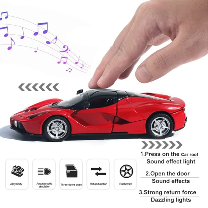 • 🚗【Fun Toy Car】Package include 1 x Laferrari Car Model. All Doors and Tail Can Be Opened,The Front and Rear Are Equipped with High Brightness LED Lights,Engine Sound.Pressing the roof will trigger engine sounds and lights, and open the door to trigger the lights of the front and rear lights and sounds.