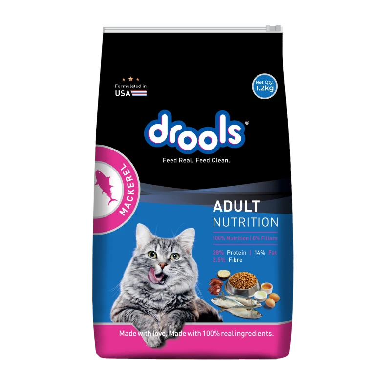 Drools Adult Dry Cat Food is a complete and balanced feed of crunchy chunks packed with real mackerel. Made with high quality ingredients and a special blend of nutrients that support your cat’s vital system. It provides adult cats with a shiny coat, better eye sight and energy to lead to a long and active life.