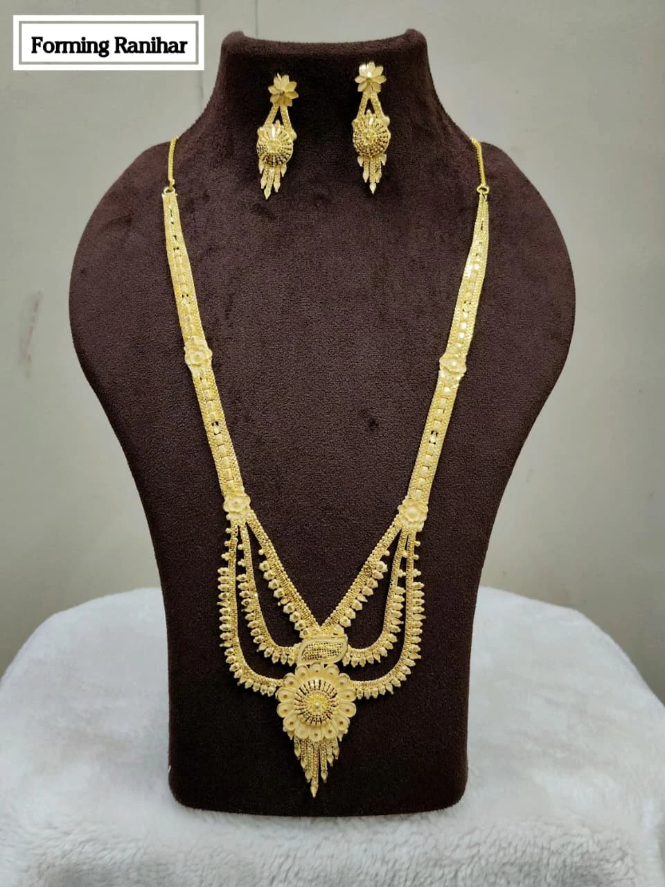 Add timeless elegance to your ethnic look with this beautifully crafted traditional necklace set, designed to enhance grace and sophistication. The set features a long, layered gold-tone necklace with intricate detailing and a stunning floral pendant, paired with matching dangling earrings for a complete festive look.