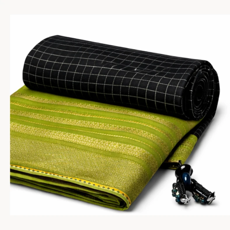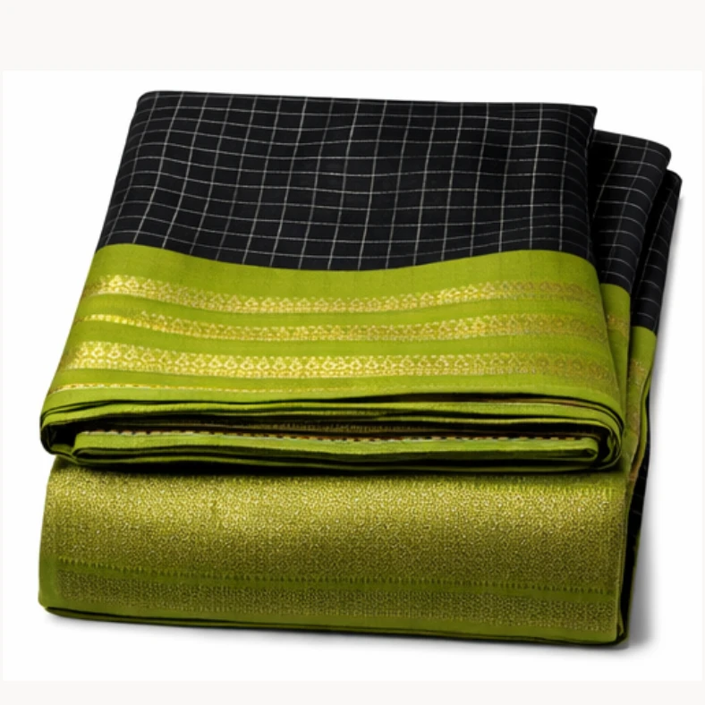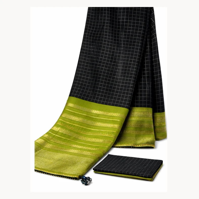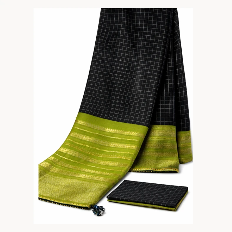 Enhance your ethnic collection with this stunning green saree featuring a sophisticated contrast black checked pallu. Designed to blend traditional elegance with modern style, this saree showcases a rich textured green body complemented by a stylish geometric check pattern.