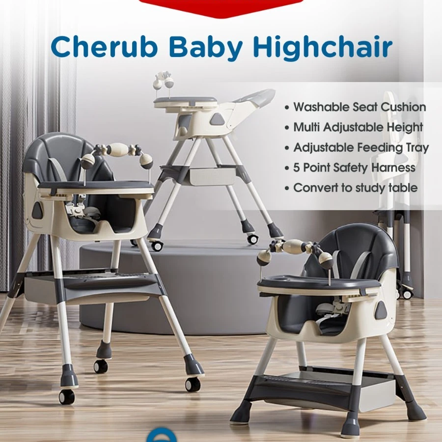 A supportive seat cushion helps keep baby comfortable, and as the baby grows, the drawer is designed to be easy to wipe and remove with one hand and for dishwasher, straps and seat cushion can be conveniently wiped and machine washed. Keep your child within reach with the 360° rotating wheels. Baby feeding chair from 4 months to 5 years 2 levels of height
