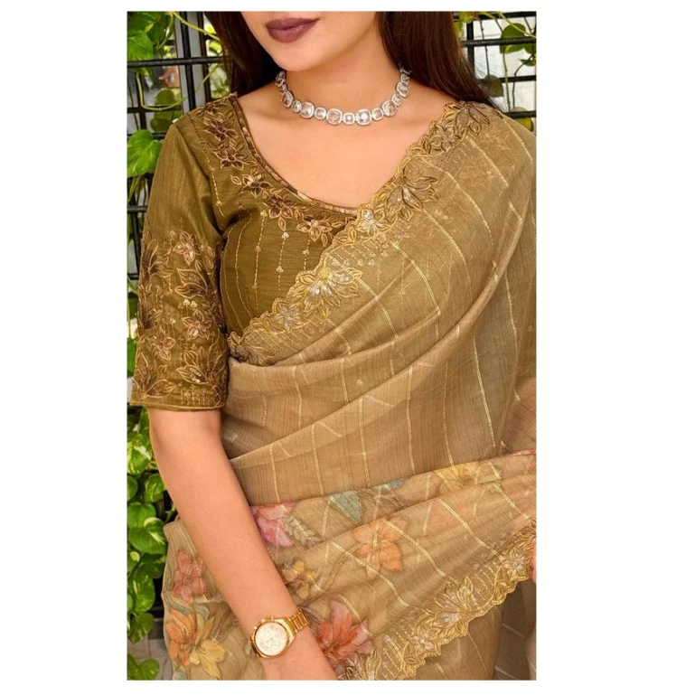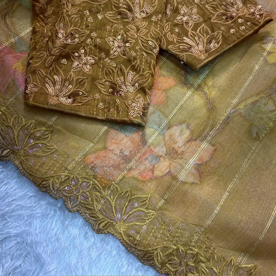 Crafted from lightweight and sheer organza fabric, this saree offers a graceful drape with a soft, flowy silhouette that flatters every body type. The subtle shimmer of sequins combined with fine thread work creates a luxurious appeal, making it perfect for weddings, festive celebrations, parties, and special occasions.