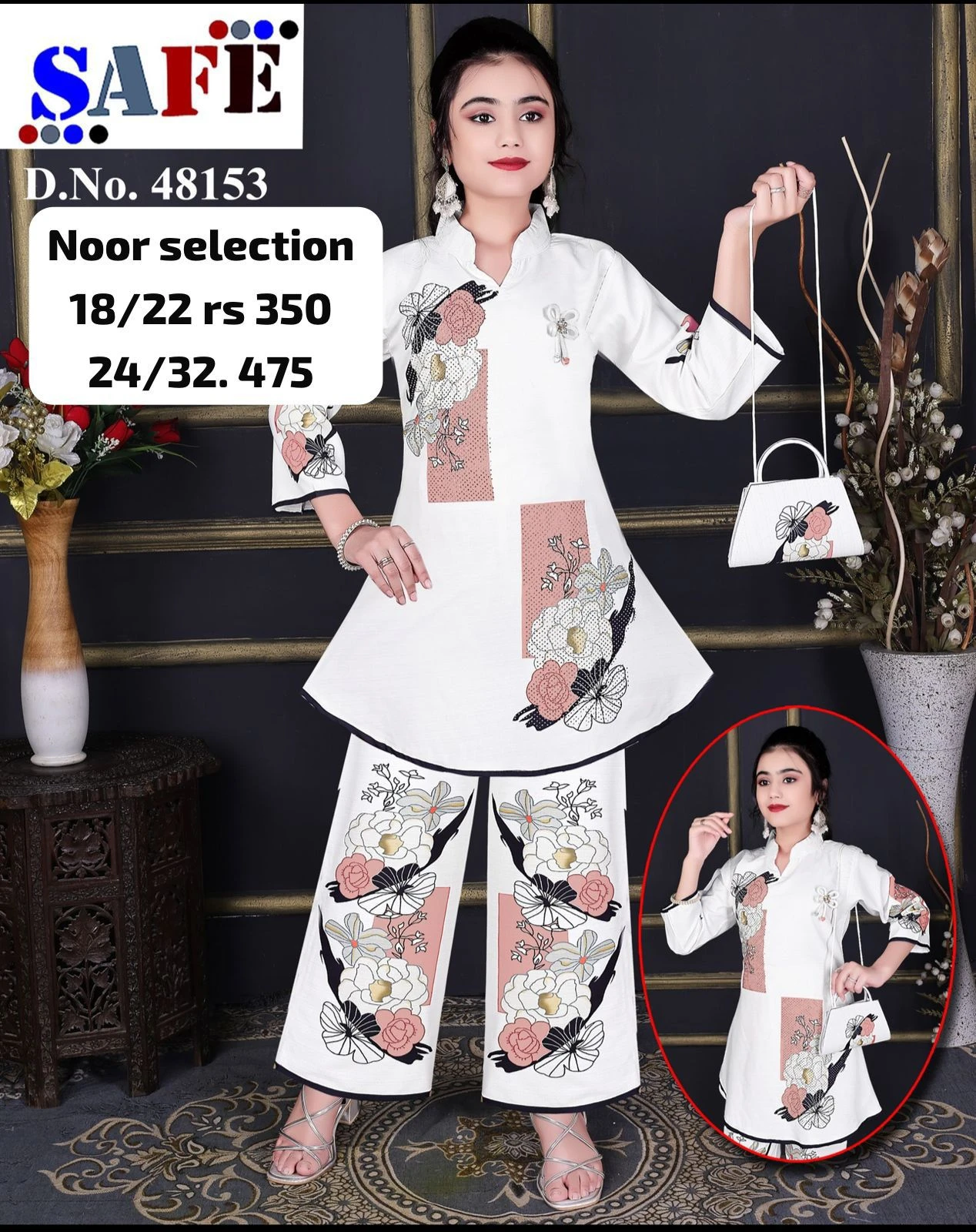 Stylish Noor Selection Girls Suit Set featuring a modern ethnic look with elegant floral print detailing. The kurta comes with a smart neckline and contrast piping, beautifully paired with matching printed pants for a trendy yet comfortable outfit.