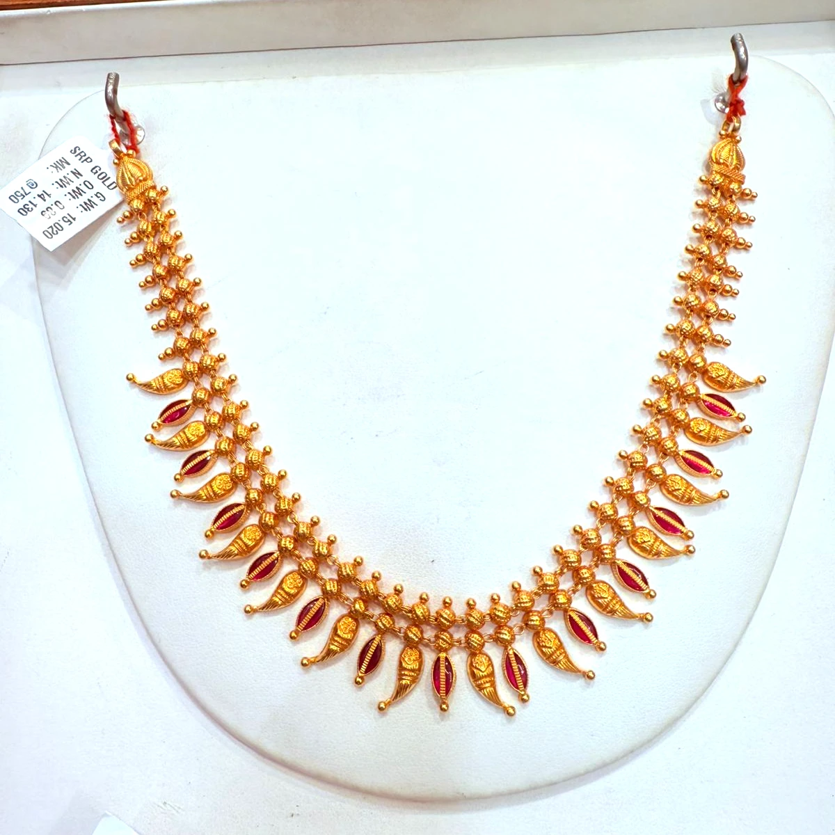 The necklace is highlighted by a grand antique-style pendant at the center, embellished with a striking red stone that adds a regal touch. Subtle green and red stone accents along the chain enhance its traditional charm, while the gold bead drops create graceful movement and depth.