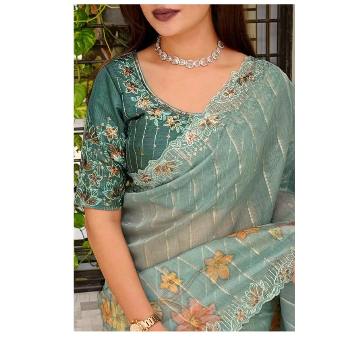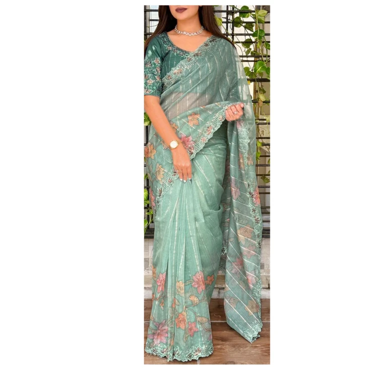 Crafted from lightweight and sheer organza fabric, this saree offers a graceful drape with a soft, flowy silhouette that flatters every body type. The subtle shimmer of sequins combined with fine thread work creates a luxurious appeal, making it perfect for weddings, festive celebrations, parties, and special occasions.