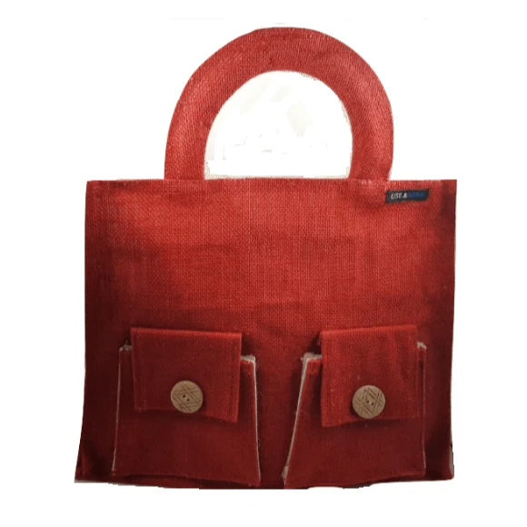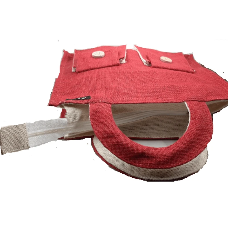 This is a very Fancy Vegetable Dye Red Jute Bag for Ladies.Zipper locks closure and Outer Pockets.Made from best quality natural Jute. Excellent quality stitching. 100% biodegradable jute bag. Made in India.