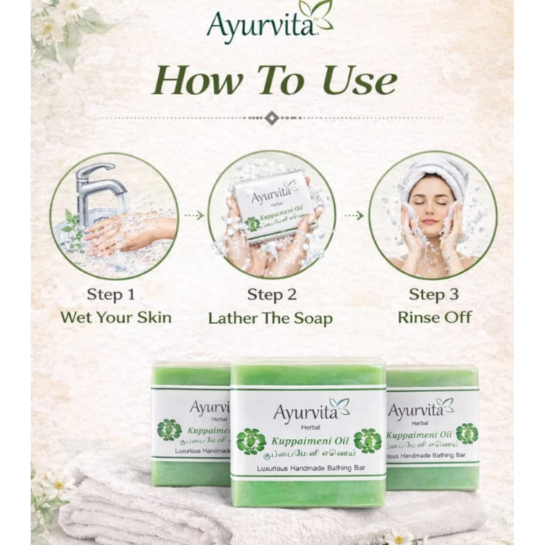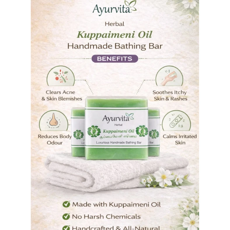 Our Herbal Kuppaimeni Oil Soap is made with the traditional goodness of Kuppaimeni (Acalypha indica), a well-known herb in Ayurvedic and Siddha practices. Enriched with herbal oils, this soap helps gently cleanse the skin while supporting clear, healthy-looking skin. Regular use helps remove impurities, control excess oil, and maintain the skin’s natural balance. Suitable for daily use and all skin types, especially beneficial for oily and problem-prone skin. This value Pack of 3 ensures long-lasting herbal care for your family.