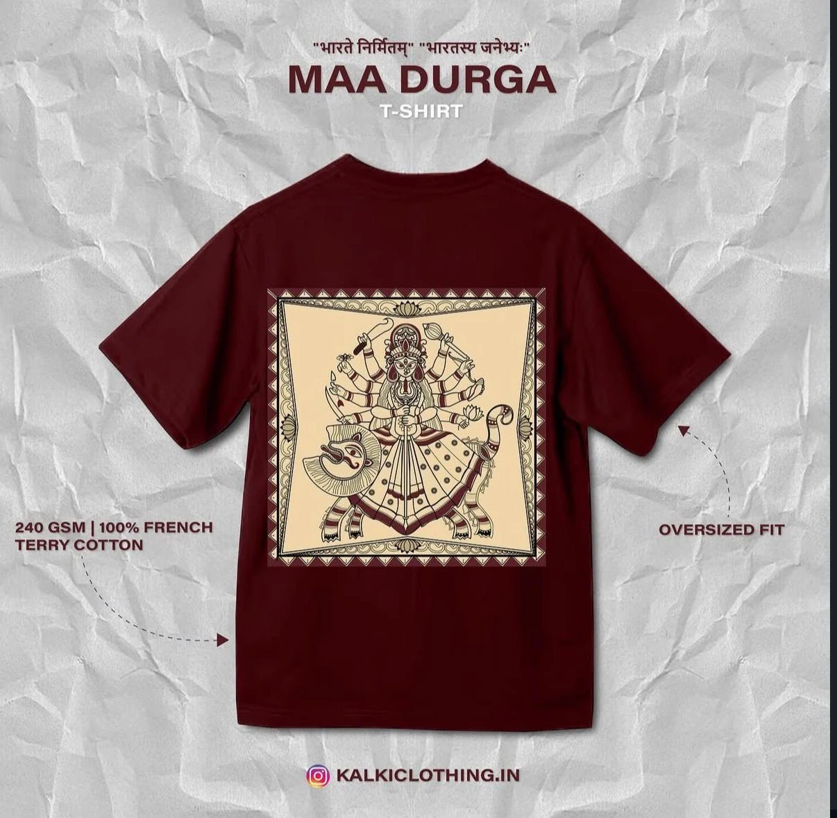 The back features a beautifully detailed Maa Durga illustration, symbolizing power, courage, and protection. Set against a deep maroon base, the artwork blends traditional Indian art with modern streetwear aesthetics.