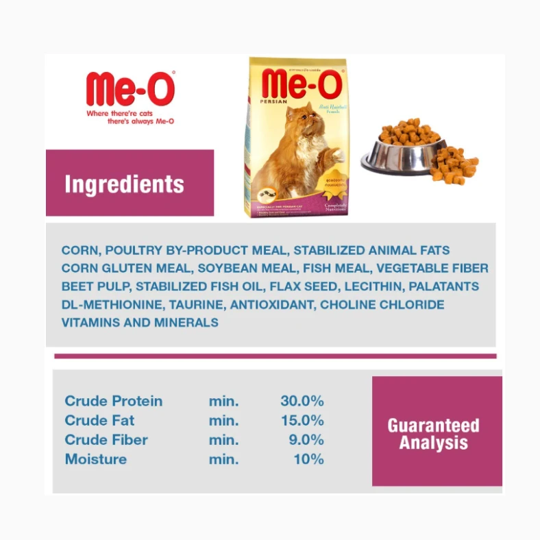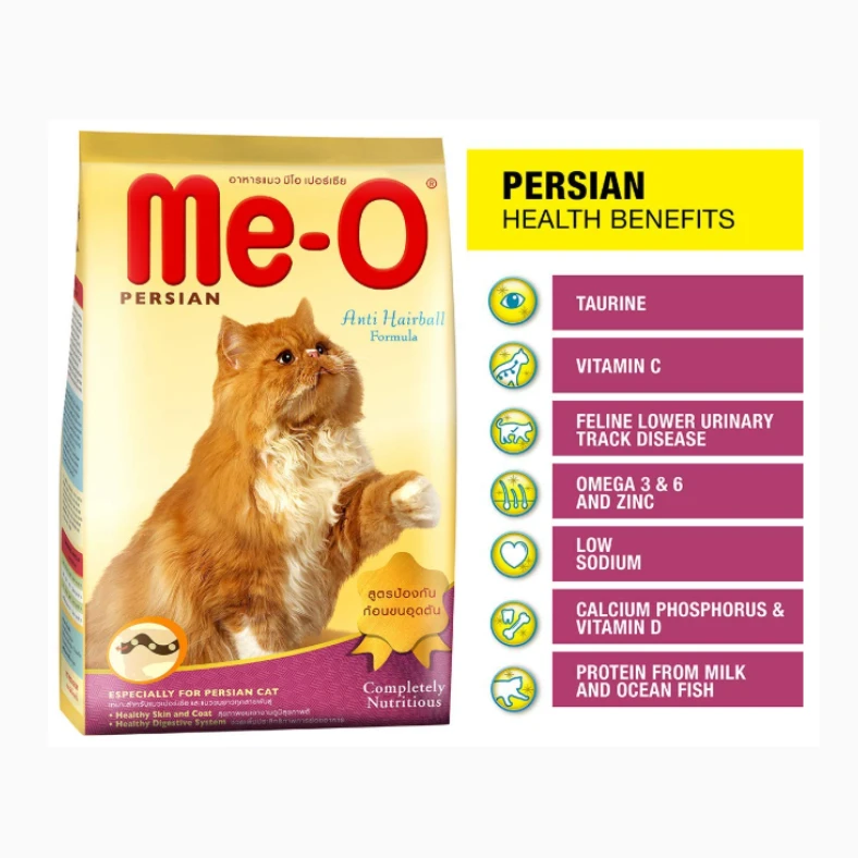 • Persian cats have long hair coat that predisposes them to hair ball problems when they swallow hair during grooming. To prevent this problem, Me-O Persian Cat Food incorporates a special fibre that continuously promotes the safe passage of swallowed hair through the digestive tract thereby reducing the risk of hairball formation.