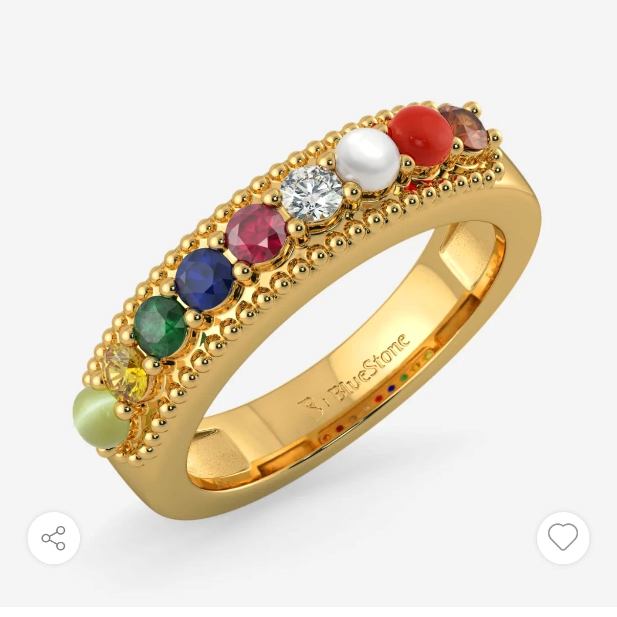 The ring showcases finely placed multicolor stones including ruby, pearl, coral, emerald, yellow sapphire, diamond, blue sapphire, hessonite, and cat’s eye — each carefully set within a delicately beaded gold frame that enhances its luxurious appeal. The polished gold finish and refined detailing make this ring both meaningful and stylish.