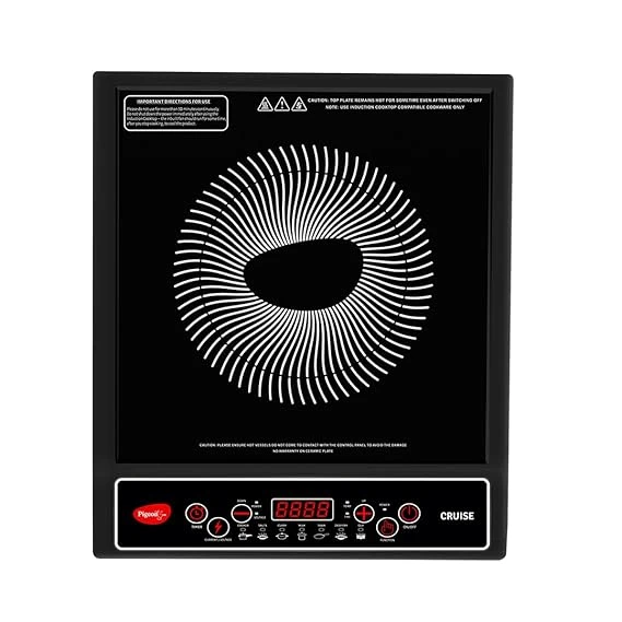 • Pigeon Cruise Induction Cooktop Comes with 7 segments LED display for power and temperature. This Induction Stove comes with high-grade electrical that protects against short circuits. It's superior top plate cans with-stand very high temperatures, making it very durable;Smart timer for hands free cooking , Cord length : 1.3 meter. Worktop Material:Carbon Steel, Preset timer - auto switch off , Soft push button, Temperature Control: Manual