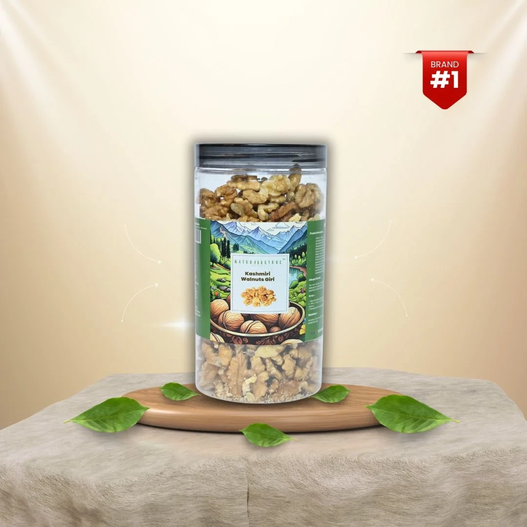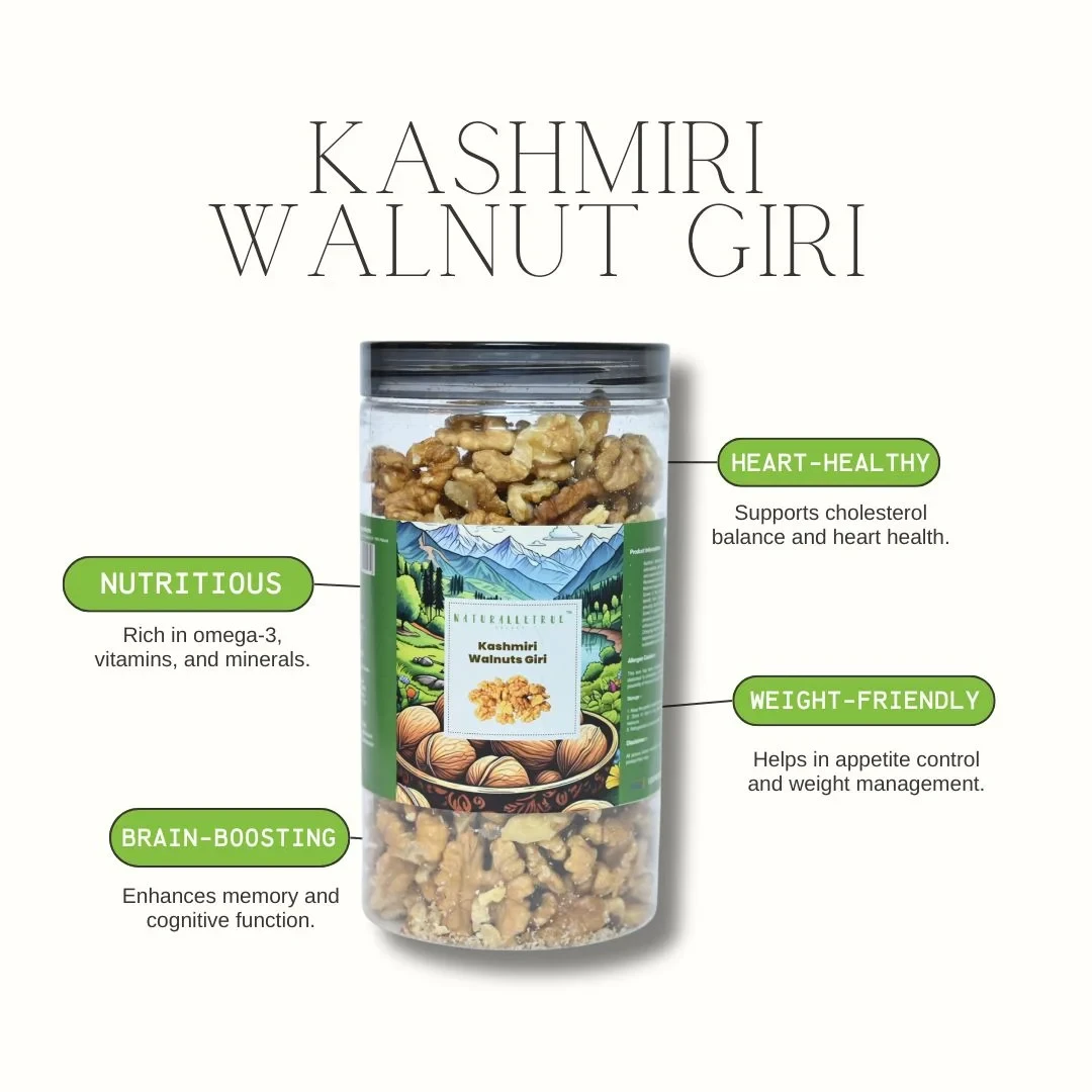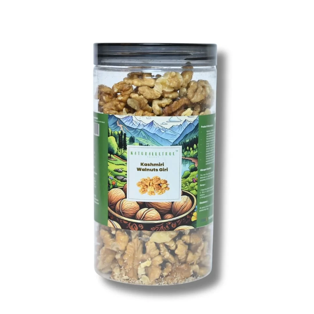 NaturalleTrue Kashmiri Walnut Giri offers the finest quality walnuts, handpicked from the pristine valleys of Kashmir. Packed with essential nutrients, these walnuts are rich in Omega-3, antioxidants, and healthy fats, making them a perfect addition to your daily diet. Enjoy their natural crunch and mild, buttery flavor in salads, desserts, smoothies, or as a healthy snack. Our walnuts are 100% natural, free from preservatives, and hygienically packed to retain freshness.