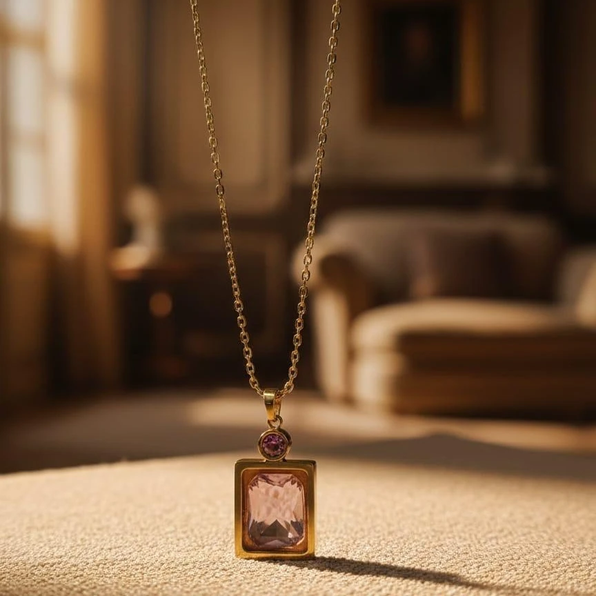Enhance your jewelry collection with this Premium Rectangular Crystal Gold Pendant Necklace. Featuring a beautifully cut rectangular blush-pink crystal stone, this pendant radiates elegance and sophistication. The sleek gold-finish frame perfectly highlights the gemstoneβs brilliance, while the delicate round accent stone on top adds an extra touch of charm.