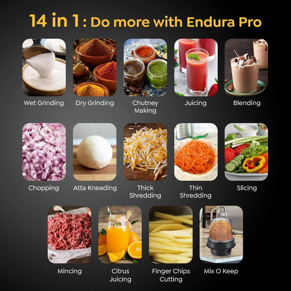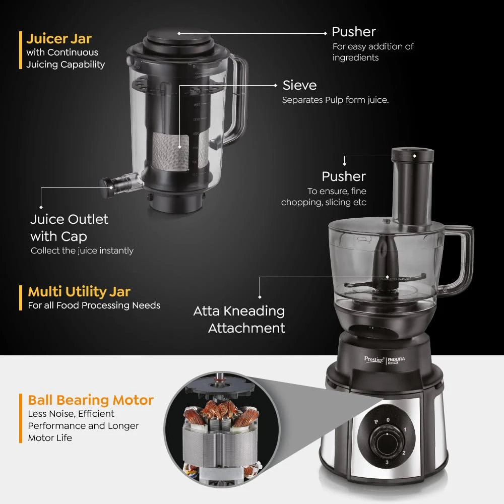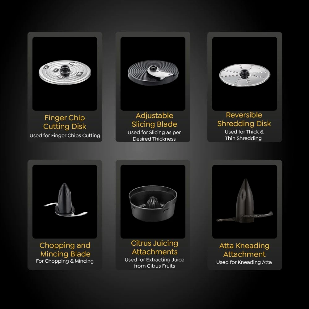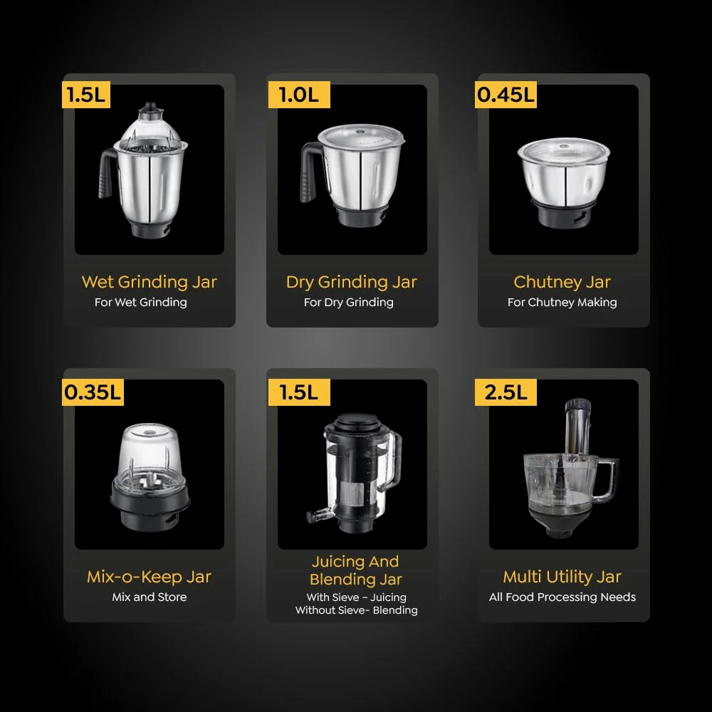 | Special Feature | 1x Mixer Grinder Base Unit, 1x SS Wet Jar 1500 ml with Blade, 1x SS Dry Jar 1000 ml with Blade, 1x Juicer Jar 1500 ml with sieve and Blade, 1x SS Chutney Jar with Blade, 1x Mix-O-Keep Jar, 1x Transparent Multi Utility Jar, 1x Finger Chip Disc, 1x Atta Kneading Blade, 1x Slicing disc, 1x Shredding disc, 1 chopping and Mincing Blade, 1x Citrus Juicing attachment, 4 Polycarbonate Jar Lids, 1 Polypropylene Juicer Lid, Spatula & Measuring Cup, User's Manual, Warranty Card.1x Mixer Grinder Base Unit, 1x SS Wet Jar 1500 ml with Blade, 1x SS Dry Jar 1000 ml with Blade, 1x Juicer Jar 1500 ml with sieve and Blade, 1x SS Chutney Jar with Blade, 1x Mix-O-Keep… See more |