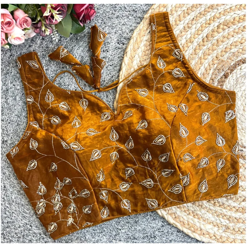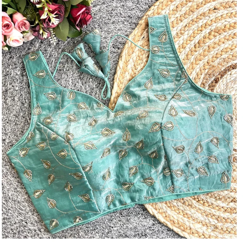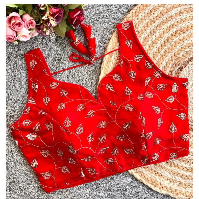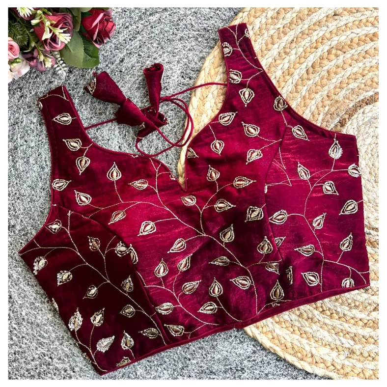 The blouse comes with a stylish V-shape neckline and a flattering structured fit that enhances your silhouette beautifully. The back-open pattern with designer dori and tassels adds a contemporary yet traditional charm, making it perfect for weddings, festive occasions, and special celebrations.