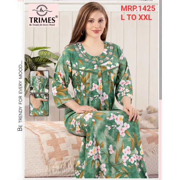 Stay comfortable and stylish with this elegant women’s rayon nighty, designed for everyday relaxation and peaceful sleep. Made from soft, breathable fabric, this night dress feels gentle on the skin and ensures all-night comfort. The beautiful printed pattern with a modern neckline adds a touch of charm, making it perfect for both lounging at home and bedtime wear. Its relaxed fit allows easy movement, while the lightweight material keeps you cool and comfortable in every season.