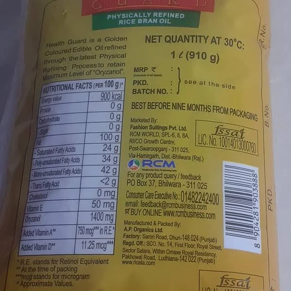 Health Guard oil is latest process inrefining of oil inwhich no harsh chemical/caustic is used while refining resulting in better retention of anti-oxidents and MEDICINALvalues of that oil.