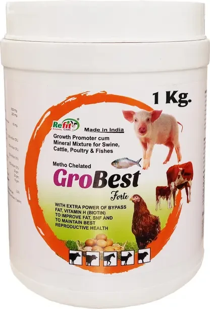 GROBEST Forte is a Metho Chelated Mineral Mixture Powder by REFIT ANIMAL CARE. It's Mineral Mixture for Cow, Swine, Cattle, Goat, Sheet, Pig, Poultry, Fishes and Farm Animals with Metho Chelation. It act as a Growth Promoter For Livestock Animals. Its Ideal supplement used to mixed with cow food for better growth, Increase Milk, SNF and Fat Percentage in Milk. KEEPS YOUR ANIMALS HEALTHY.