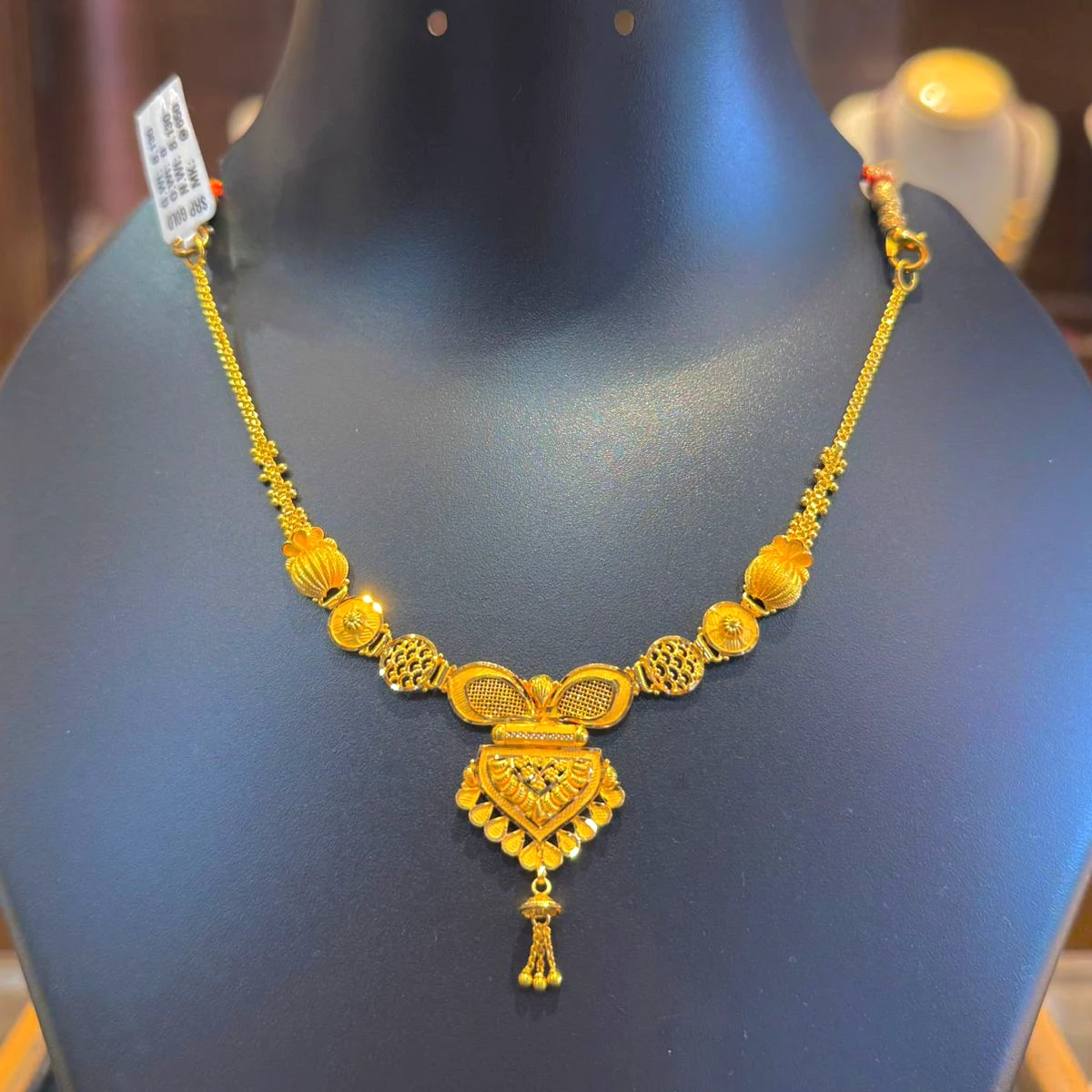The highlight of the necklace is its intricately crafted filigree pendant, showcasing layered patterns, fine detailing, and elegant gold dangler drops that add movement and charm. The balanced design gives it a sophisticated look suitable for both everyday elegance and special occasions.