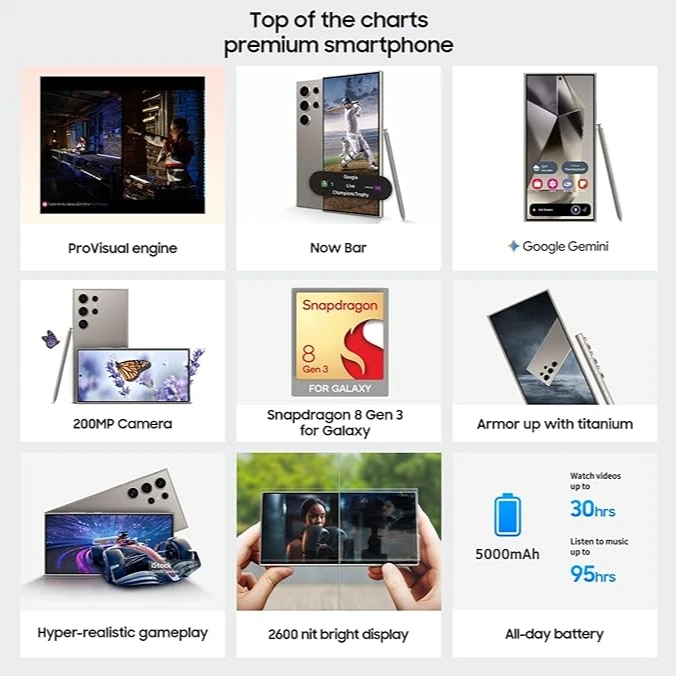 • Epic Camera - With the most megapixels on a Galaxy smartphone ever (200MP) and AI processing, Galaxy S24 Ultra sets the industry standard for image quality every time you hit the shutter. Also, the new ProVisual engine recognizes objects, improves color tone, reduces noise and brings out every detail.