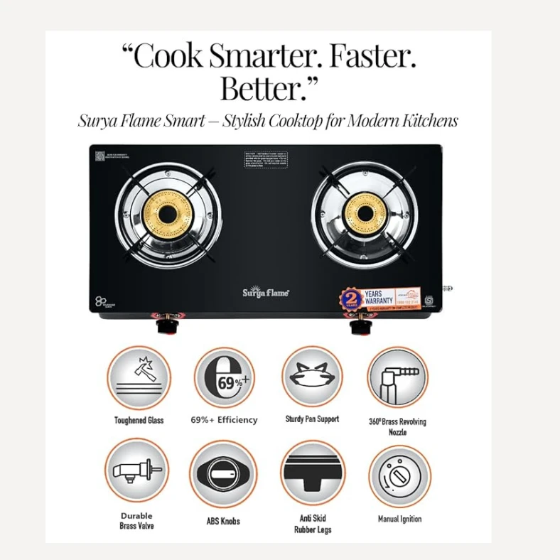 Fuel-Efficient Brass Burners: Comes with 2 rust-resistant brass burners (1 Large & 1 Medium) for consistent flame, faster cooking, and better gas savings.
