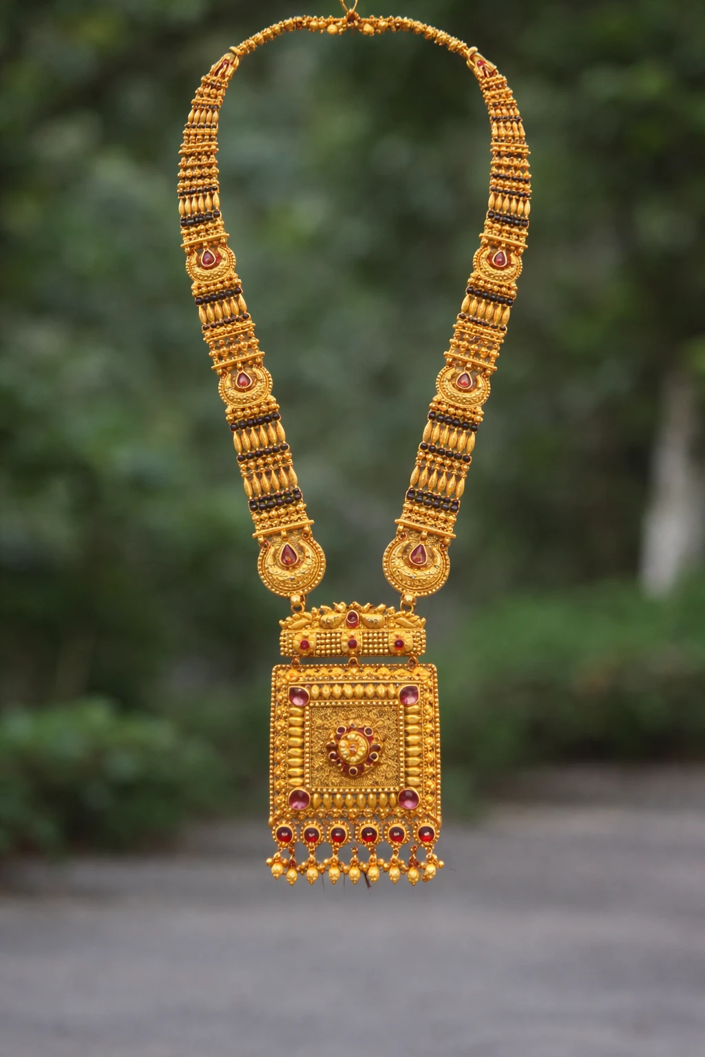 This stunning long necklace features intricate traditional detailing with layered gold beadwork and an ornate square pendant centerpiece. The pendant is richly embellished with carved motifs and ruby-toned accents, giving it a classic South Indian temple jewelry appeal.