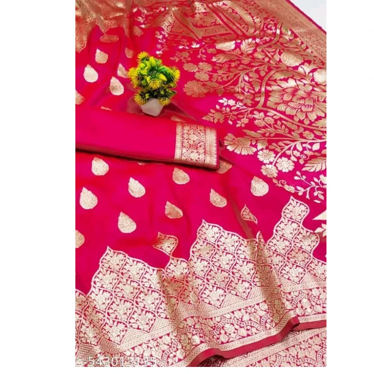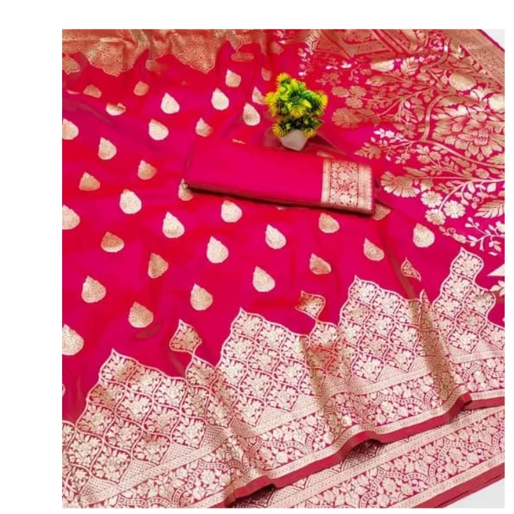 Add timeless grace to your ethnic wardrobe with this stunning pink Banarasi silk saree. Designed with beautiful golden zari motifs all over and a richly woven traditional border, this saree exudes elegance and royalty. The intricate craftsmanship on the pallu and border enhances its festive and wedding appeal.