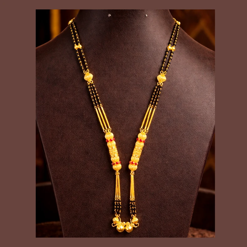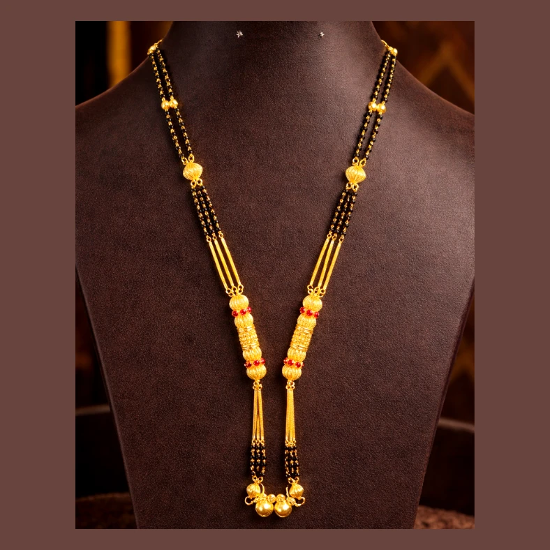 Add timeless elegance to your jewellery collection with this beautifully crafted traditional gold finish mangalsutra long necklace. Designed with classic black beads and intricate gold detailing, this piece features stylish cylindrical gold elements with delicate red stone accents and elegant hanging drops.