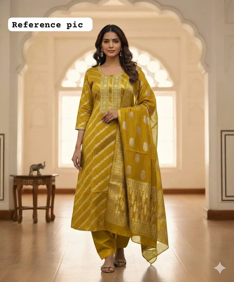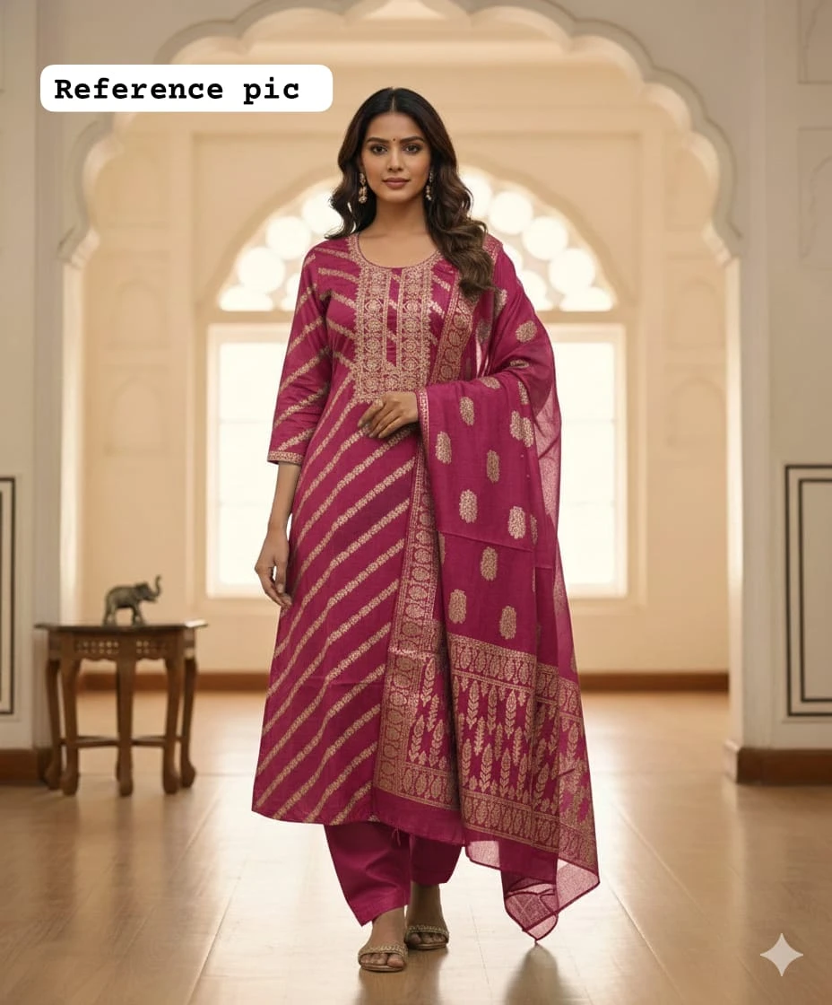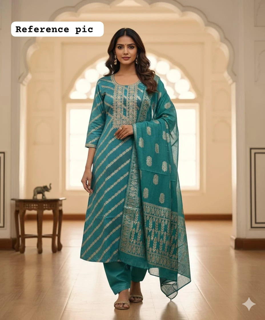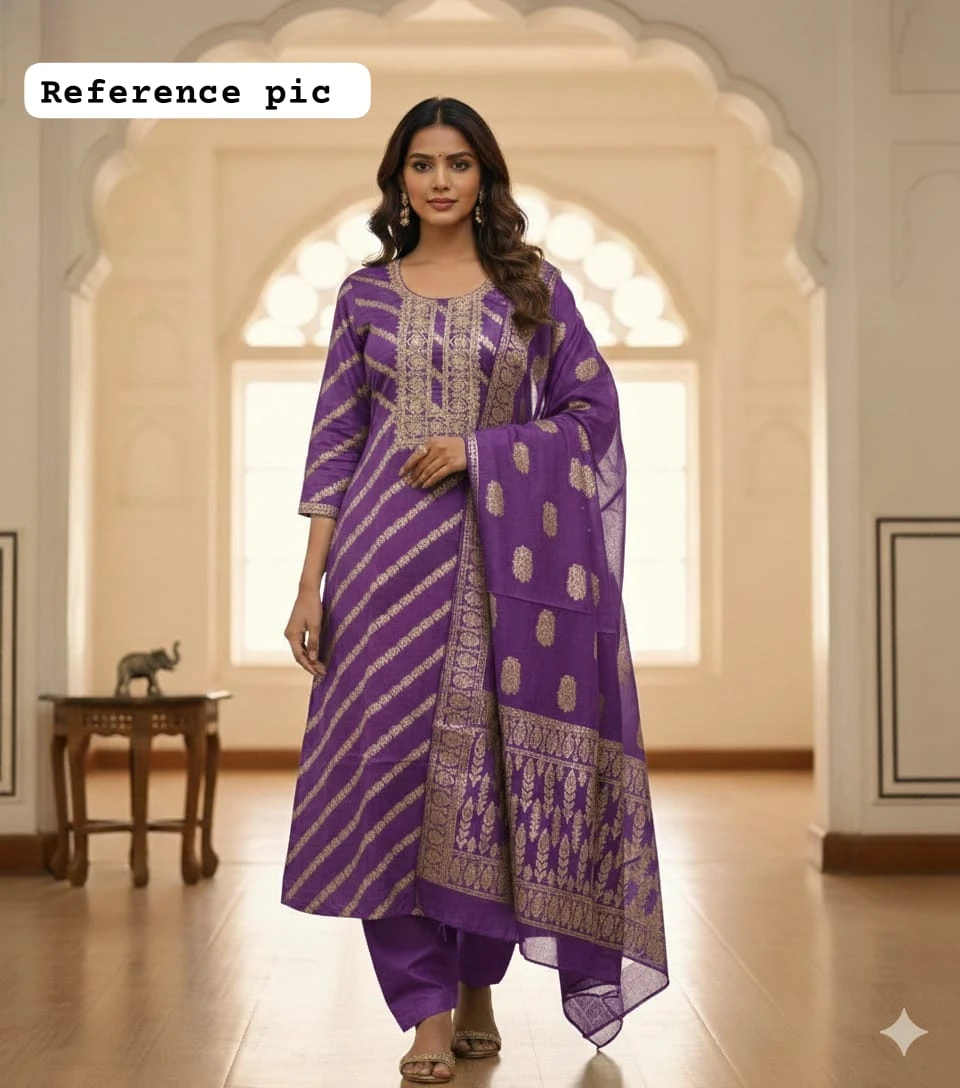 The kurta features a stylish silhouette with fine detailing, paired with a well-fitted matching bottom. The coordinated dupatta enhances the overall look, adding a graceful touch that completes the ensemble. Ideal for casual outings, office wear, festive celebrations, and family gatherings.
